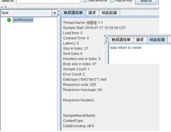 sr.setResponseData("data return by server", "utf-8"); //第二个参数 为编码, 设置JMeter GUI "取样器结果" DataEncoding: utf-8 //第二个参数为"",则表示默认为GBK编码