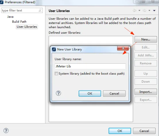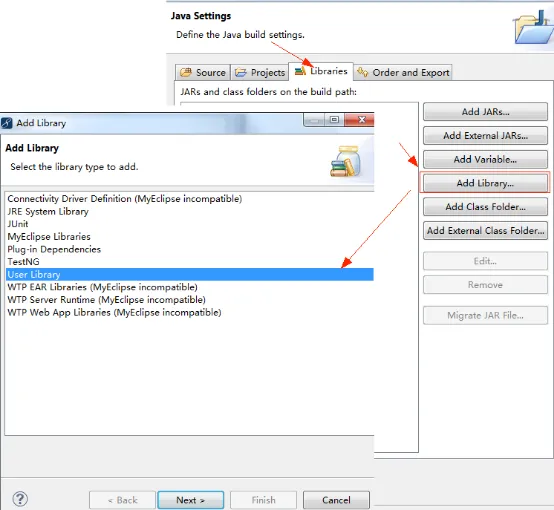 如上图,切换到Libraries标签页->选择Add Library -> User Libray,点击Next按钮,打开以下User Libraries界面