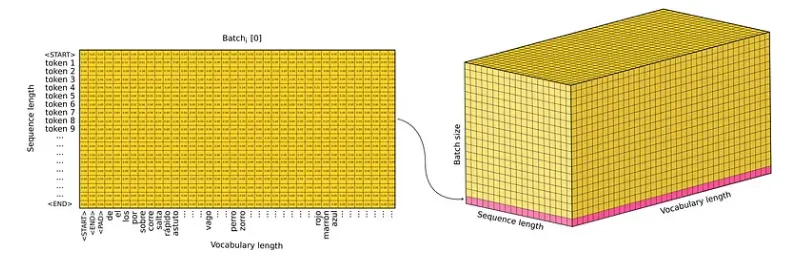 如前一节所述,Transformer接受两个输入(源和目标)。在训练期间,Transformer 能够一次处理所有输入,这意味着输入张量仅通过模型一次。输出实际上是上图中呈现的 3 维概率张量。