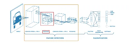 • 池化层通常会分别作用于每个输入的特征并减小其大小。目前最常用形式的池化层是每隔2个元素从图像划分出的区块,然后对每个区块中的4个数取最大值(平均值及其他)。这将会减少75%的数据量。