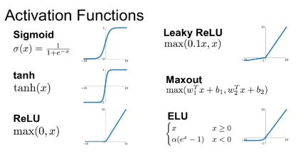 • 激活函数(activation functions)的目标是,将神经网络非线性化。激活函数是连续的(continuous),且可导的(differential)。