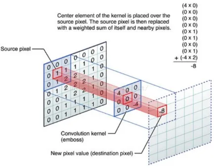 放在图像分析里,f(x) 可以理解为原始像素点(source pixel),所有的原始像素点叠加起来,就是原始图了。g(x)可以称为作用点,所有作用点合起来我们称为卷积核(Convolution kernel)(我们在遥感影像处理中称为“算子”)。卷积核上所有作用点依次作用于原始像素点后(即乘起来),线性叠加的输出结果,即是最终卷积的输出,也是我们想要的结果,我们称为destination pixel.