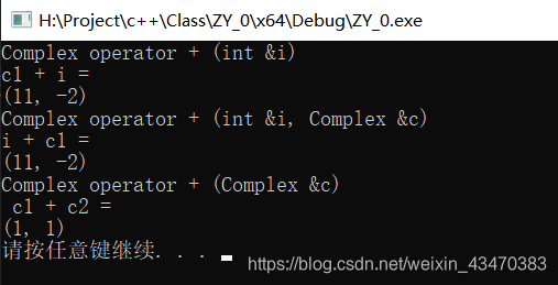 Complex operator + (Complex &c) // 形参是 Complex 类对象的引用,要求实参为 Complex 类对象 { return Complex(real + c.real, imag + c.imag); // 注意在表达式中重载的运算符 "+" 右侧应为 Complex 类的对象 // 比如 c3 = c1 + c2 }