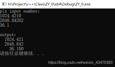 /* ************************************************************************* @file: main.cpp @date: 2020.12.23 @author: Xiaoxiao @brief: 从键盘输入一批数值,要求保留3位小数,在输出时上下行小数点对齐 @blog: https://blog.csdn.net/weixin_43470383/article/details/111592803 ************************************************************************* */ #include<iostream> #include<iomanip> using namespace std; int main() { double num[3]; cout << "pls input number:" << endl; for (int i = 0; i < 3; i++) cin >> num[i]; cout << setiosflags(ios::fixed) << setprecision(3) << setiosflags(ios::right); // 保留3位小数,并且控制右对齐 cout << endl << "output:" << endl; for (int i = 0; i < 3; i++) cout << setw(10) << num[i] << endl; system("pause"); return 0; }