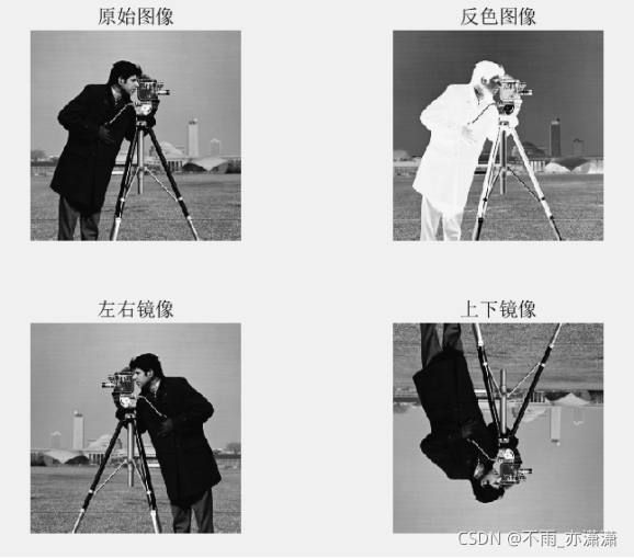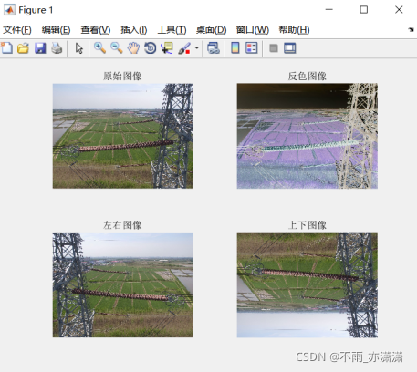 clc; clear all; close all; x=imread('tower.jpg'); %首先读取图像文件 subplot(2,2,1) imshow(x) title('原始图像') subplot(2,2,2) y=255-double(x); %对图像进行反色处理 y=uint8(y); imshow(y) title('反色图像') subplot(2,2,3) lr_tw = fliplr(x); % 左右翻转 imshow(lr_tw) % 显示左右翻转效果 title('左右图像') subplot(2,2,4) ud_tw = flipud(x); % 上下翻转 imshow(ud_tw) % 显示上下翻转效果 title('上下图像')