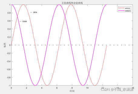 % Step1:产生曲线的数据,确定函数和自变量范围 clear all; clc; x=linspace(0, 4*pi, 400); % 自变量范围从0到4*pi x1=linspace(0, 16, 32); y1=sin(x); y2=cos(x); y3=0; % 法一:以横纵坐标作为 plot 函数参数 % plot(x, y1) % hold on % plot(x, y2) % 法二:以矩阵作为 plot 函数参数 A=[y1 ; y2]'; B=[x ; x]'; plot(B, A) % Step2:选择合适的线形、标记、颜色 % 颜色:正弦曲线为红色,余弦曲线为紫色 % 线形:sinx 虚线,cosx 实线 plot(x, y1, 'r:', x, y2, 'm', x1, y3, 'k.') gtext('\leftarrowsinx') gtext('\leftarrowcosx') % Step3:添加图例及文字说明信息 legend('sinx', 'cosx') % Step4:添加坐标轴说明与图标题 axis([0 16 -1 1]) title('正弦曲线和余弦曲线, Hxx') ylabel('幅度') xlabel('时间')