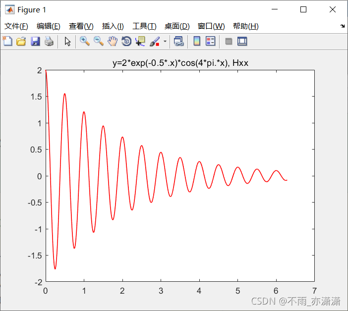 clear all; clc; x=linspace(0, 2*pi, 400); y=2*exp(-0.5.*x).*cos(4*pi.*x); plot(x, y, 'r', 'LineWidth',1) title('y=2*exp(-0.5*.x)*cos(4*pi.*x), Hxx') axis([0 7 -2 2]);