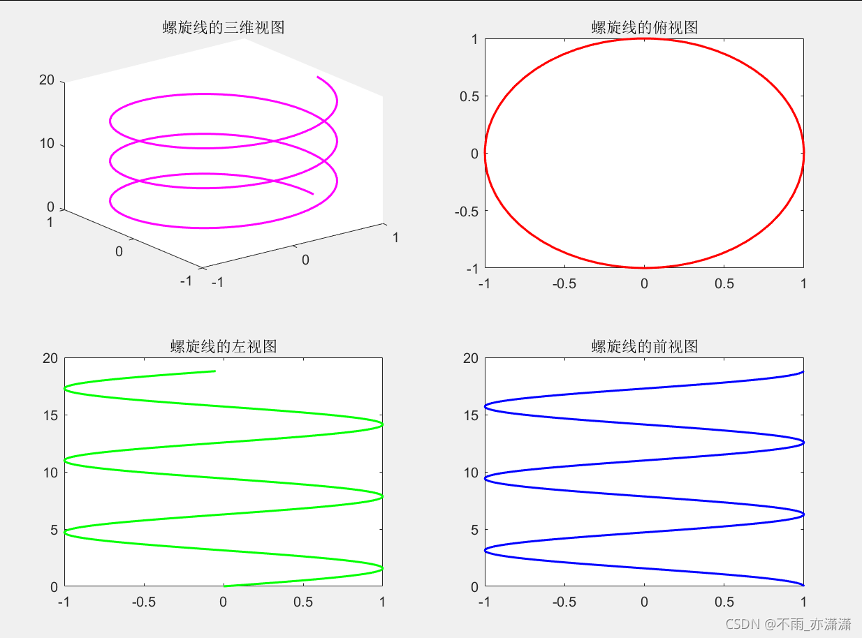 clear all; clc; z=0:0.1:6*pi; x=cos(z); y=sin(z); subplot(2,2,1) plot3(x,y,z,'m'); title('螺旋线的三维视图') subplot(2,2,2) plot3(x,y,z,'r'); title('螺旋线的俯视图') view(0, 90) subplot(2,2,3) plot3(x,y,z,'g'); title('螺旋线的左侧视图') view(90, 0) subplot(2,2,4) plot3(x,y,z,'b'); title('螺旋线的前视图') view(0, 0)