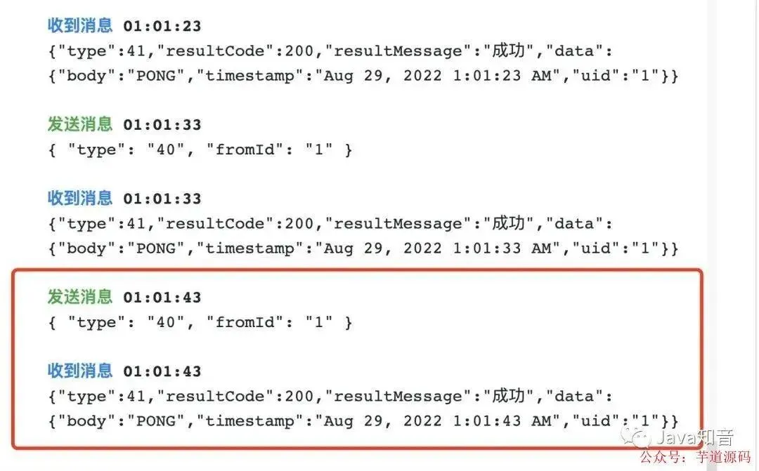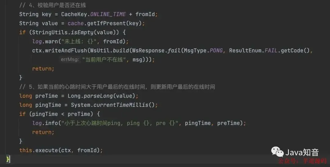 2、后端检测,用户是否还在线,如果在线,则刷新用户的最新在线时间,并回复 PONG 消息。