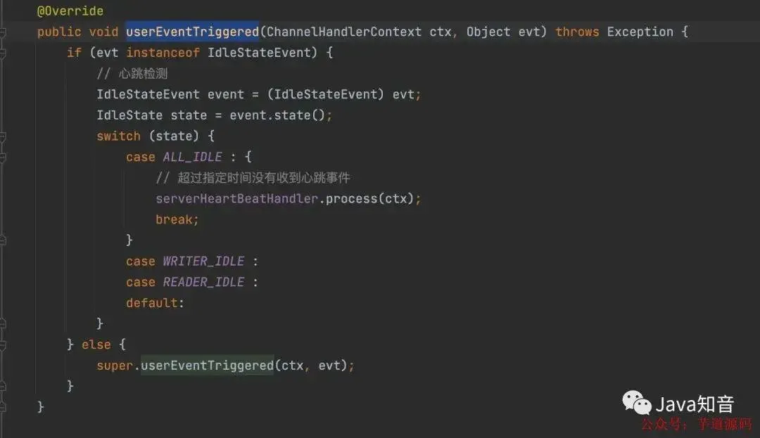 TextWebSocketFrameHandler 继承 SimpleChannelInboundHandler 类,并实现 userEventTriggered 方法,具体代码如下所示: