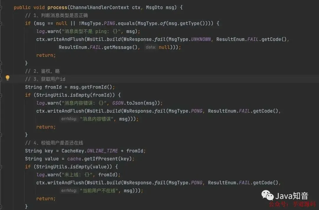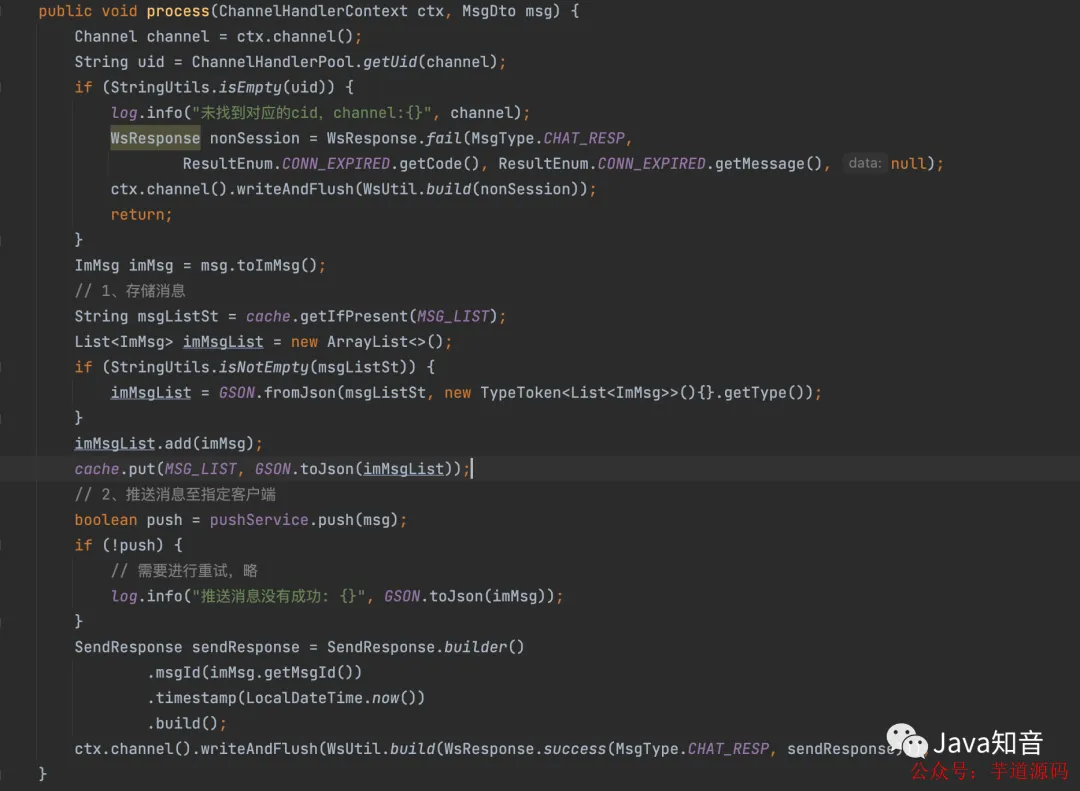 2、服务端(ChatProcessor)对消息进行处理,具体代码如下所示: