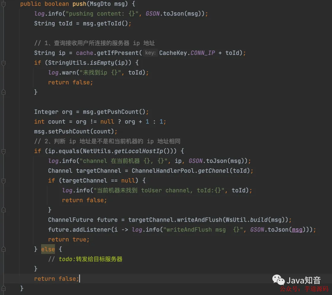 1、获取消息接受者所连接的服务器 ip 地址 2、判断当前服务器 ip 地址是否和上面的 ip 地址相同,如果相同则推送消息,否则转发给目标服务器