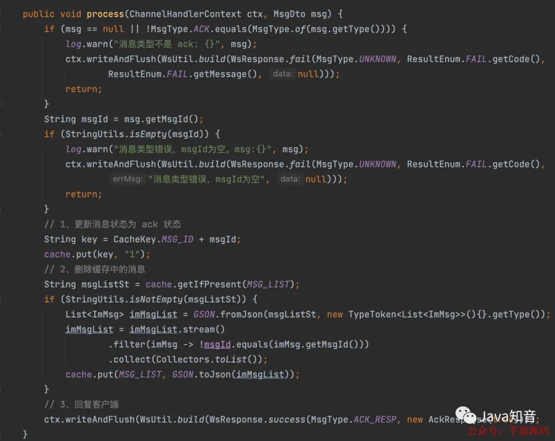 2、服务端收到 ack 消息,变更消息状态(AckProcessor),具体代码如下图所示: