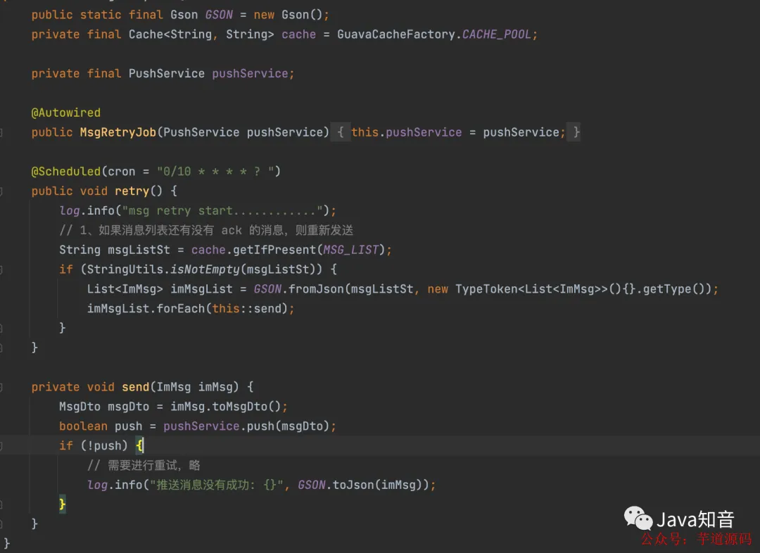 这里因为是单机版 im,所以直接采用 SpringBoot-Job 实现,Job 代码如下所示: