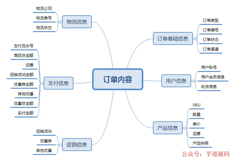 以一个通用B2C商城的订单为例,梳理其包含的信息如下:
