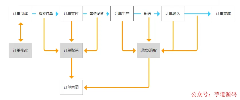 上面说到逆向流程是各种修改订单、取消订单、退款、退货等操作,需要梳理清楚这些流程与正向流程的关系,才能理清订单系统完整的订单流程。