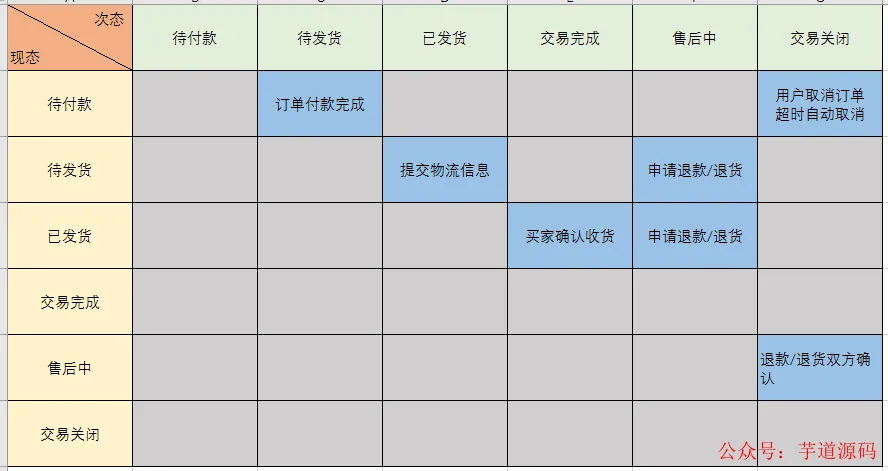 状态机是管理订单状态逻辑的工具。状态机可归纳为3个要素,即现态、动作、次态。