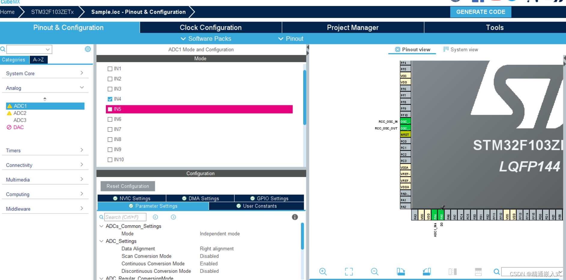 这里我采用的是ADC1通道4所以光敏电阻的A0就应该接在对应的ADC通道上。
