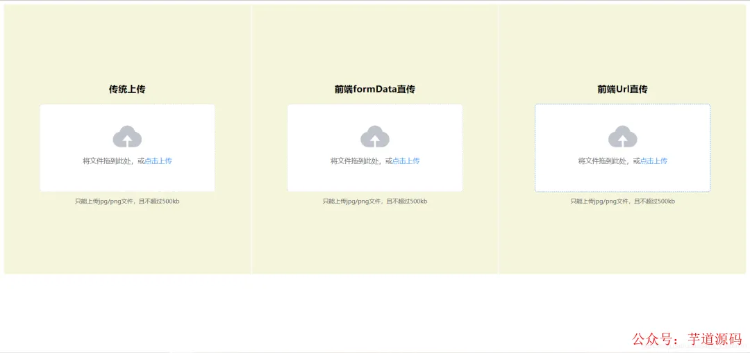 <!DOCTYPE html> <html> <head> <meta charset="UTF-8"> <!-- import CSS --> <link rel="stylesheet" href="https://unpkg.com/element-ui/lib/theme-chalk/index.css"> <title>上传图片</title> </head> <body> <div id="app"> <el-row :gutter="2"> <el-col :span="8"> <div class="div-center-class"> <div class=""> <center><h3>传统上传</h3></center> <el-upload class="upload-demo" action="#" drag :http-request="uploadHandle"> <i class="el-icon-upload"></i> <div class="el-upload__text">将文件拖到此处,或<em>点击上传</em></div> <div class="el-upload__tip" slot="tip">只能上传jpg/png文件,且不超过500kb</div> </el-upload> <div v-if="imgUrl"> <img :src="imgUrl" style="width: 40px;height: 40px"></img> </div> </div> </div> </el-col> <el-col :span="8"> <div class="div-center-class"> <div class=""> <center><h3>前端formData直传</h3></center> <el-upload class="upload-demo" action="#" drag :http-request="httpRequestHandle"> <i class="el-icon-upload"></i> <div class="el-upload__text">将文件拖到此处,或<em>点击上传</em></div> <div class="el-upload__tip" slot="tip">只能上传jpg/png文件,且不超过500kb</div> </el-upload> <div v-if="directUrl"> <img :src="directUrl" style="width: 40px;height: 40px"></img> </div> </div> </div> </el-col> <el-col :span="8"> <div class="div-center-class"> <div class=""> <center><h3>前端Url直传</h3></center> <el-upload class="upload-demo" action="#" drag :http-request="UrlUploadHandle"> <i class="el-icon-upload"></i> <div class="el-upload__text">将文件拖到此处,或<em>点击上传</em></div> <div class="el-upload__tip" slot="tip">只能上传jpg/png文件,且不超过500kb</div> </el-upload> <div v-if="uploadUrl"> <img :src="uploadUrl" style="width: 40px;height: 40px"></img> </div> </div> </div> </el-col> </el-row> </div> </body> <!-- import Vue before Element --> <script src="https://unpkg.com/vue/dist/vue.js"></script> <!-- import JavaScript --> <script src="https://unpkg.com/element-ui/lib/index.js"></script> <!--import axios --> <script src="https://unpkg.com/axios/dist/axios.min.js"></script> <script> new Vue({ el: '#app', data: function () { return { imgUrl: '', directUrl: '', uploadUrl: '' } }, methods: { uploadHandle(options) { let {file} = options; this.traditionPost(file); }, traditionPost(file) { _that = this const form = new FormData(); form.append("fileName", file.name); form.append("file", file); this.axiosPost("post", "/upload", form).then(function (res) { if (res.status === 200) { _that.imgUrl = res.data.data } else { alert("上传失败!") } }) }, getpolicy(file) { _that = this axios.get('policy?fileName=' + file.name) .then(function (response) { let {xamzalgorithm, xamzcredential, policy, xamzsignature, xamzdate, host} = response.data.data; let formData = new FormData(); formData.append("key", file.name); formData.append("x-amz-algorithm", xamzalgorithm); // 让服务端返回200,不设置则默认返回204。 formData.append("x-amz-credential", xamzcredential); formData.append("policy", policy); formData.append("x-amz-signature", xamzsignature); formData.append("x-amz-date", xamzdate); formData.append("file", file); // 发送 POST 请求 _that.axiosPost("post", host, formData).then(function (res) { if (res.status === 204) { axios.get('url?fileName=' + file.name).then(function (res) { _that.directUrl = res.data.data; }) } else { alert("上传失败!") } }) }) }, httpRequestHandle(options) { let {file} = options; this.getpolicy(file); }, UrlUploadHandle(options) { let {file} = options; this.getUploadUrl(file); }, getUploadUrl(file) { _that = this console.log(file) axios.get('uploadUrl?fileName=' + file.name) .then(function (response) { let url = response.data.data; // 发送 put 请求 let config = {'Content-Type': file.type} _that.axiosPost("put", url, file, config).then(function (res) { if (res.status === 200) { axios.get('url?fileName=' + file.name).then(function (res) { _that.uploadUrl = res.data.data; }) } else { alert("上传失败!") } }) }) }, //封装 //axios封装post请求 axiosPost(method, url, data, config) { let result = axios({ method: method, url: url, data: data, headers: config }).then(resp => { return resp }).catch(error => { return "exception=" + error; }); return result; } } }) </script> <style> .div-center-class { padding: 28% 0%; text-align: center; background: beige; } </style> </html>