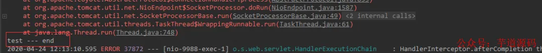 2020-04-24 10:53:14.939 INFO 14086 --- [nio-9988-exec-1] com.ymy.controller.TestController : test --- start 2020-04-24 10:54:02.450 INFO 14086 --- [extShutdownHook] o.s.s.concurrent.ThreadPoolTaskExecutor : Shutting down ExecutorService 'applicationTaskExecutor' java.lang.InterruptedException: sleep interrupted at java.lang.Thread.sleep(Native Method) at com.ymy.controller.TestController.test(TestController.java:26) at sun.reflect.NativeMethodAccessorImpl.invoke0(Native Method) at sun.reflect.NativeMethodAccessorImpl.invoke(NativeMethodAccessorImpl.java:62) at sun.reflect.DelegatingMethodAccessorImpl.invoke(DelegatingMethodAccessorImpl.java:43) at java.lang.reflect.Method.invoke(Method.java:498) at org.springframework.web.method.support.InvocableHandlerMethod.doInvoke(InvocableHandlerMethod.java:190) at org.springframework.web.method.support.InvocableHandlerMethod.invokeForRequest(InvocableHandlerMethod.java:138) at org.springframework.web.servlet.mvc.method.annotation.ServletInvocableHandlerMethod.invokeAndHandle(ServletInvocableHandlerMethod.java:105) at org.springframework.web.servlet.mvc.method.annotation.RequestMappingHandlerAdapter.invokeHandlerMethod(RequestMappingHandlerAdapter.java:879) at org.springframework.web.servlet.mvc.method.annotation.RequestMappingHandlerAdapter.handleInternal(RequestMappingHandlerAdapter.java:793) at org.springframework.web.servlet.mvc.method.AbstractHandlerMethodAdapter.handle(AbstractHandlerMethodAdapter.java:87) at org.springframework.web.servlet.DispatcherServlet.doDispatch(DispatcherServlet.java:1040) at org.springframework.web.servlet.DispatcherServlet.doService(DispatcherServlet.java:943) at org.springframework.web.servlet.FrameworkServlet.processRequest(FrameworkServlet.java:1006) at org.springframework.web.servlet.FrameworkServlet.doGet(FrameworkServlet.java:898) at javax.servlet.http.HttpServlet.service(HttpServlet.java:634) at org.springframework.web.servlet.FrameworkServlet.service(FrameworkServlet.java:883) at javax.servlet.http.HttpServlet.service(HttpServlet.java:741) at org.apache.catalina.core.ApplicationFilterChain.internalDoFilter(ApplicationFilterChain.java:231) at org.apache.catalina.core.ApplicationFilterChain.doFilter(ApplicationFilterChain.java:166) at org.apache.tomcat.websocket.server.WsFilter.doFilter(WsFilter.java:53) at org.apache.catalina.core.ApplicationFilterChain.internalDoFilter(ApplicationFilterChain.java:193) at org.apache.catalina.core.ApplicationFilterChain.doFilter(ApplicationFilterChain.java:166) at org.springframework.web.filter.RequestContextFilter.doFilterInternal(RequestContextFilter.java:100) at org.springframework.web.filter.OncePerRequestFilter.doFilter(OncePerRequestFilter.java:119) at org.apache.catalina.core.ApplicationFilterChain.internalDoFilter(ApplicationFilterChain.java:193) at org.apache.catalina.core.ApplicationFilterChain.doFilter(ApplicationFilterChain.java:166) at org.springframework.web.filter.FormContentFilter.doFilterInternal(FormContentFilter.java:93) at org.springframework.web.filter.OncePerRequestFilter.doFilter(OncePerRequestFilter.java:119) at org.apache.catalina.core.ApplicationFilterChain.internalDoFilter(ApplicationFilterChain.java:193) at org.apache.catalina.core.ApplicationFilterChain.doFilter(ApplicationFilterChain.java:166) at org.springframework.boot.actuate.metrics.web.servlet.WebMvcMetricsFilter.doFilterInternal(WebMvcMetricsFilter.java:109) at org.springframework.web.filter.OncePerRequestFilter.doFilter(OncePerRequestFilter.java:119) at org.apache.catalina.core.ApplicationFilterChain.internalDoFilter(ApplicationFilterChain.java:193) at org.apache.catalina.core.ApplicationFilterChain.doFilter(ApplicationFilterChain.java:166) at org.springframework.web.filter.CharacterEncodingFilter.doFilterInternal(CharacterEncodingFilter.java:201) at org.springframework.web.filter.OncePerRequestFilter.doFilter(OncePerRequestFilter.java:119) at org.apache.catalina.core.ApplicationFilterChain.internalDoFilter(ApplicationFilterChain.java:193) at org.apache.catalina.core.ApplicationFilterChain.doFilter(ApplicationFilterChain.java:166) at org.apache.catalina.core.StandardWrapperValve.invoke(StandardWrapperValve.java:202) at org.apache.catalina.core.StandardContextValve.invoke(StandardContextValve.java:96) at org.apache.catalina.authenticator.AuthenticatorBase.invoke(AuthenticatorBase.java:541) at org.apache.catalina.core.StandardHostValve.invoke(StandardHostValve.java:139) at org.apache.catalina.valves.ErrorReportValve.invoke(ErrorReportValve.java:92) at org.apache.catalina.core.StandardEngineValve.invoke(StandardEngineValve.java:74) at org.apache.catalina.connector.CoyoteAdapter.service(CoyoteAdapter.java:343) at org.apache.coyote.http11.Http11Processor.service(Http11Processor.java:373) at org.apache.coyote.AbstractProcessorLight.process(AbstractProcessorLight.java:65) at org.apache.coyote.AbstractProtocol$ConnectionHandler.process(AbstractProtocol.java:868) at org.apache.tomcat.util.net.NioEndpoint$SocketProcessor.doRun(NioEndpoint.java:1594) at org.apache.tomcat.util.net.SocketProcessorBase.run(SocketProcessorBase.java:49) at java.util.concurrent.ThreadPoolExecutor.runWorker(ThreadPoolExecutor.java:1149) at java.util.concurrent.ThreadPoolExecutor$Worker.run(ThreadPoolExecutor.java:624) at org.apache.tomcat.util.threads.TaskThread$WrappingRunnable.run(TaskThread.java:61) at java.lang.Thread.run(Thread.java:748) 2020-04-24 10:54:04.574 INFO 14086 --- [nio-9988-exec-1] com.ymy.controller.TestController : test --- end 2020-04-24 10:54:04.610 ERROR 14086 --- [nio-9988-exec-1] o.s.web.servlet.HandlerExecutionChain : HandlerInterceptor.afterCompletion threw exception java.lang.NullPointerException: null at org.springframework.boot.actuate.metrics.web.servlet.LongTaskTimingHandlerInterceptor.stopLongTaskTimers(LongTaskTimingHandlerInterceptor.java:123) ~[spring-boot-actuator-2.2.6.RELEASE.jar:2.2.6.RELEASE] at org.springframework.boot.actuate.metrics.web.servlet.LongTaskTimingHandlerInterceptor.afterC