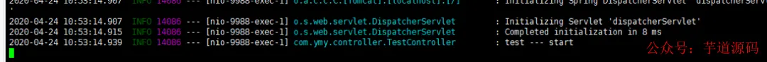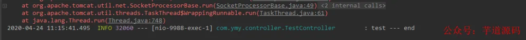 @GetMapping(value = "/test") public String test(){ log.info("test --- start"); try { Thread.sleep(100000); } catch (InterruptedException e) { e.printStackTrace(); } log.info("test --- end"); return "test"; }