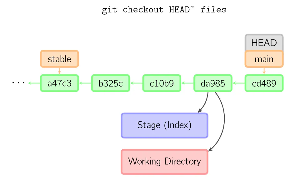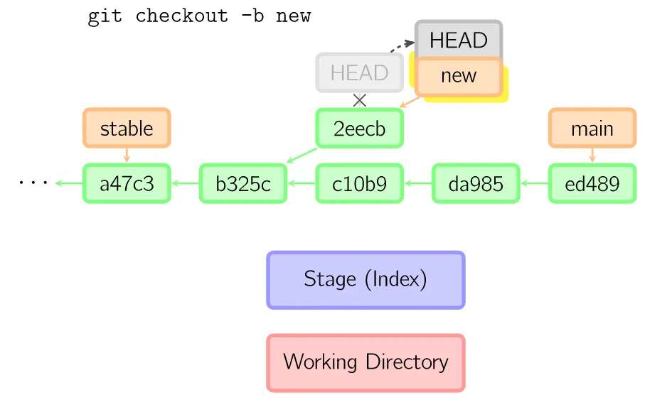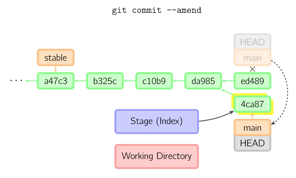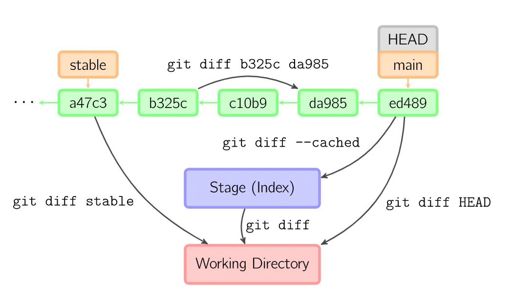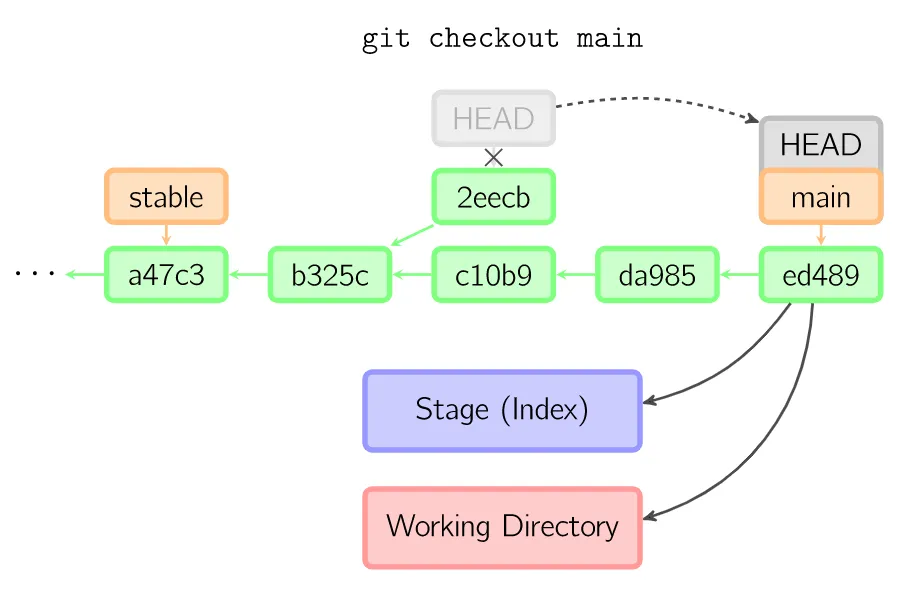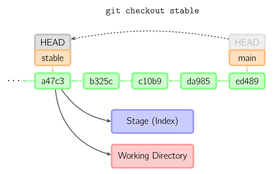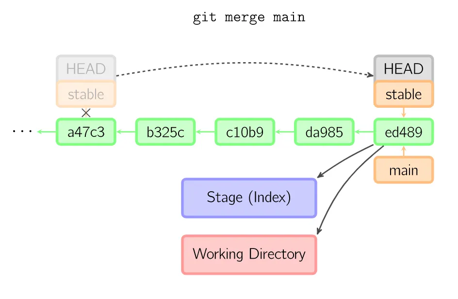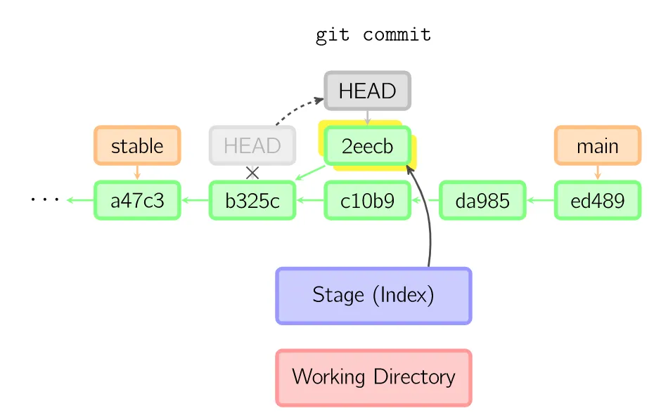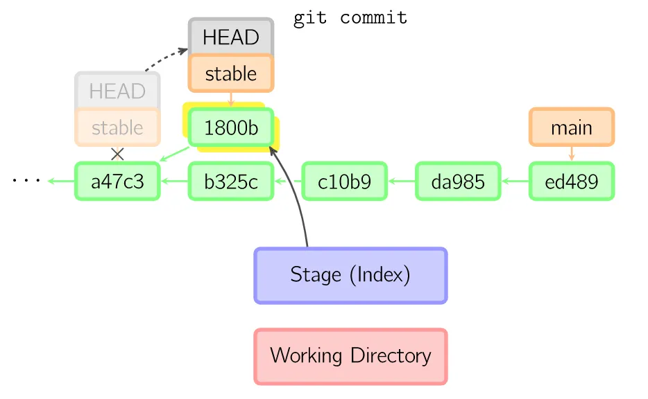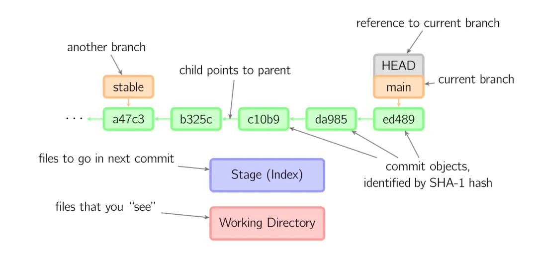 绿色的5位字符表示提交的ID,分别指向父节点。分支用橘色显示,分别指向特定的提交。当前分支由附在其上的HEAD标识。这张图片里显示最后5次提交,ed489是最新提交。main分支指向此次提交,另一个stable分支指向祖父提交节点。