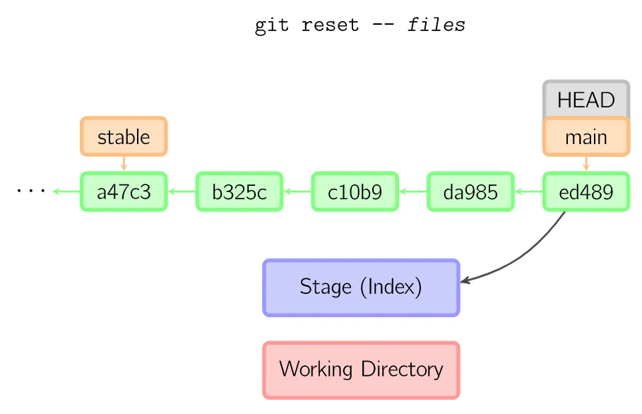 reset命令把当前分支指向另一个位置,并且有选择的变动工作目录和索引。也用来在从历史仓库中复制文件到索引,而不动工作目录。