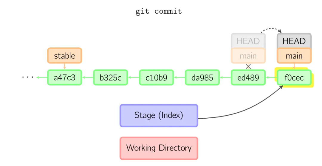 提交时,git用暂存区域的文件创建一个新的提交,并把此时的节点设为父节点。然后把当前分支指向新的提交节点。下图中,当前分支是main。在运行命令之前,main指向ed489,提交后,main指向新的节点f0cec并以ed489作为父节点。