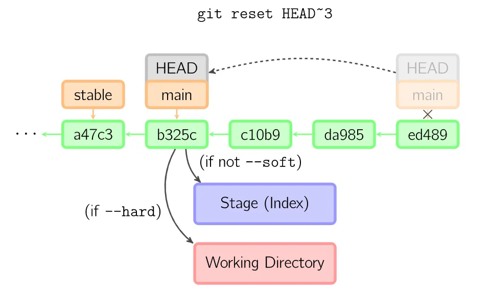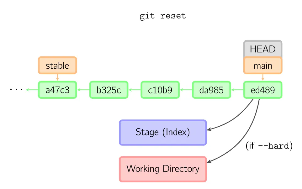 如果没有给出提交点的版本号,那么默认用HEAD。这样,分支指向不变,但是索引会回滚到最后一次提交,如果用--hard选项,工作目录也同样。