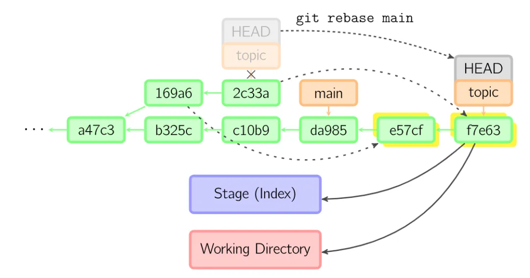 上面的命令都在topic分支中进行,而不是main分支,在main分支上重演,并且把分支指向新的节点。注意旧提交没有被引用,将被回收。