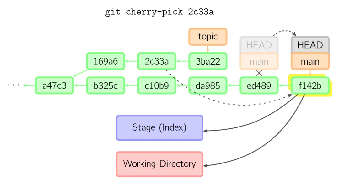 cherry-pick命令"复制"一个提交节点并在当前分支做一次完全一样的新提交。