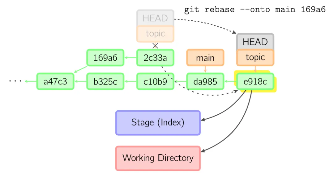 要限制回滚范围,使用--onto选项。下面的命令在main分支上重演当前分支从169a6以来的最近几个提交,即2c33a。