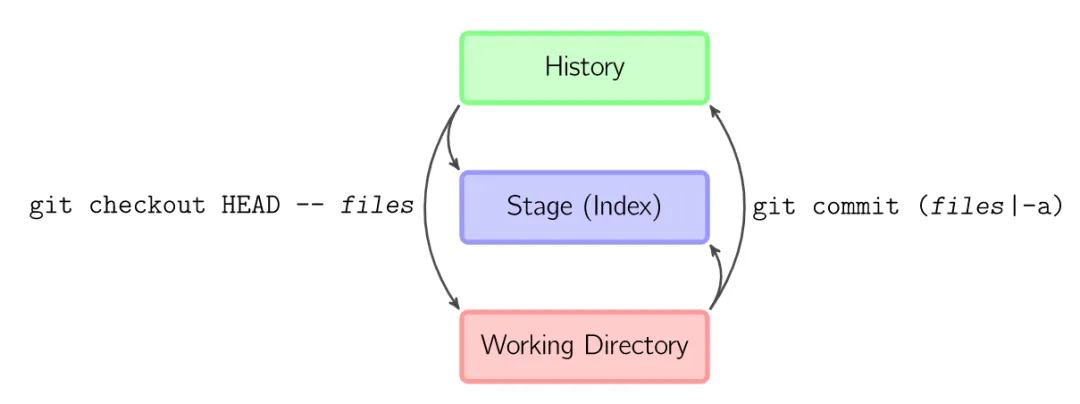 git add *files*把当前文件放入暂存区域。git commit给暂存区域生成快照并提交。git reset -- *files*用来撤销最后一次git add *files*,你也可以用git reset撤销所有暂存区域文件。git checkout -- *files*把文件从暂存区域复制到工作目录,用来丢弃本地修改。