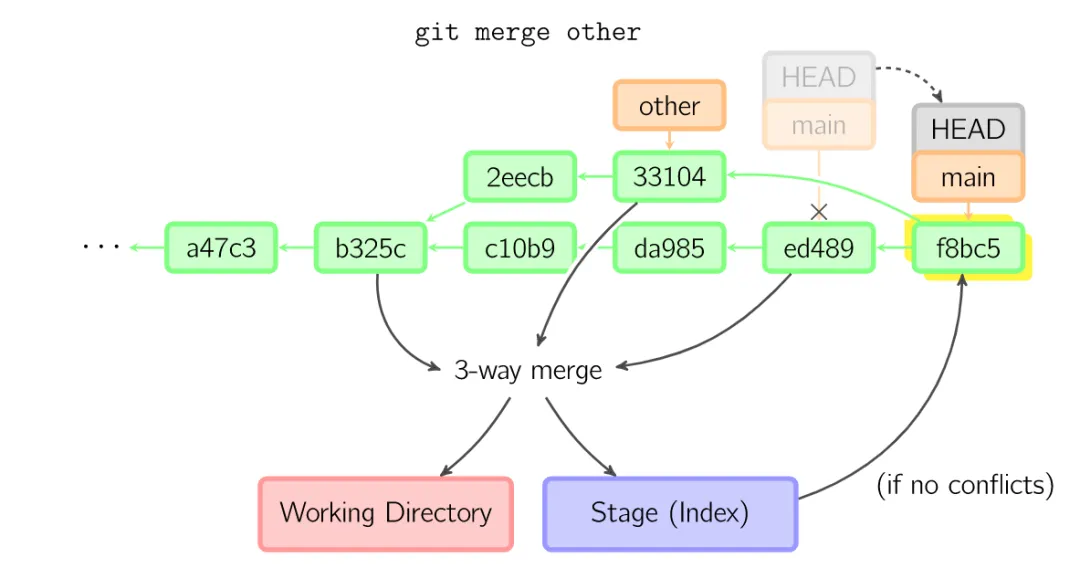否则就是一次真正的合并。默认把当前提交(ed489 如下所示)和另一个提交(33104)以及他们的共同祖父节点(b325c)进行一次三方合并。结果是先保存当前目录和索引,然后和父节点33104一起做一次新提交。