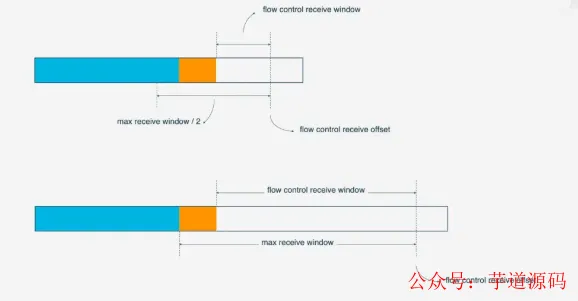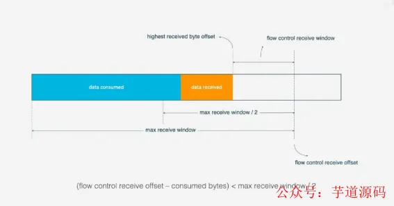 随着数据不断被处理, 接收方就有能力处理更多数据. 当满足(flow control receivce offset - consumed bytes) < (max receive window/2)时, 接收方会发送WINDOW_UPDATE frame告诉发送方你可以再多发送数据, 这时候flow control receive offset就会偏移, 接收窗口增大, 发送方可以发送更多数据到接收方.
