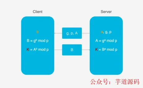 这里使用DH密钥交换算法, DH算法的核心就是服务端生成a,g,p3个随机数, a自己持有, g和p要传输给客户端, 而客户端会生成b这1个随机数, 通过DH算法客户端和服务端可以算出同样的密钥. 在这过程中a和b并不参与网络传输, 安全性大大提升. 因为p和g是大数, 所以即使在网络传输中p, g, A, B都被劫持, 靠现在的计算力算力也无法破解.