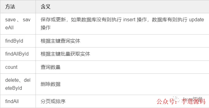 一般情况下,JpaRepository 接口中的方法就能满足大部分需求,典型方法包括: