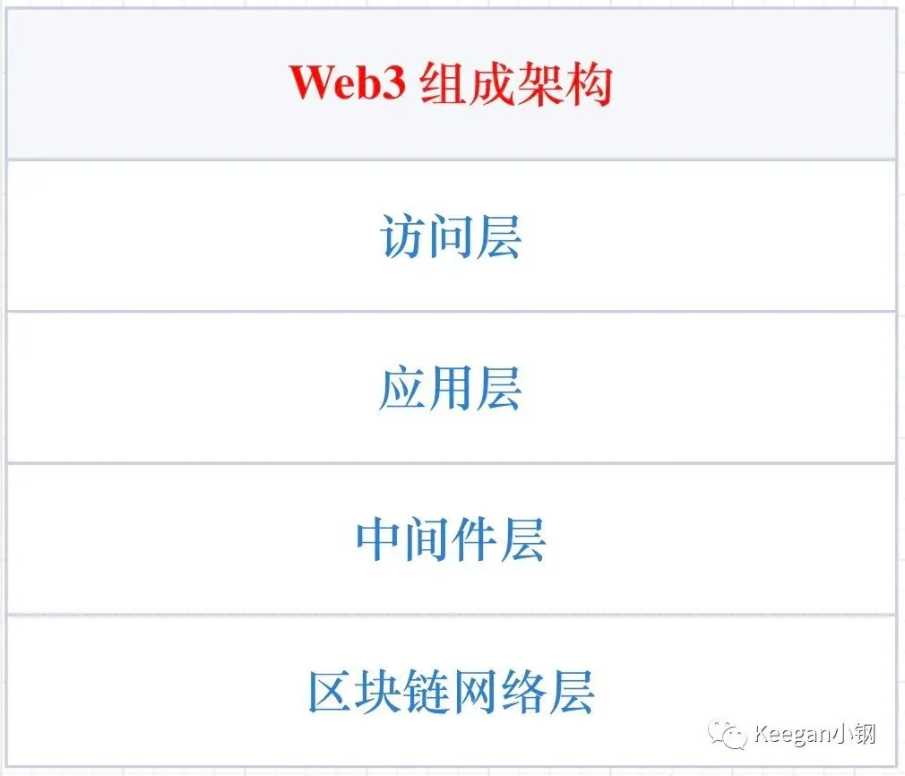 Web3 发展至今,生态已然初具雏形,如果将当前阶段的 Web3 生态组成架构抽象出一个鸟瞰图,由下而上可划分为四个层级:区块链网络层、中间件层、应用层、访问层。下面我们来具体看看每一层级都有什么。另外,此章节会涉及到很多项目的名称,因为篇幅原因不会一一进行介绍,有兴趣的可以另外去查阅相关资料进行深入了解。