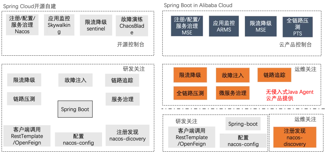 从上图我们可以看到,随着业务规模的增大,选择单体架构与微服务架构的选择趋势,他们之间存在一个交点。在交点之后,选择微服务架构,业务规模越大越可以享受到微服务架构带来的效率的提升。我们可以观察到,这个交点在持续地向左移动。数字化进程的快速发展普遍让企业的 IT 系统更复杂,开源以及云计算推进的技术标准化,正在大幅度地降低微服务架构的技术门槛,在云上小公司也可以很好地玩转微服务。随着这个趋势的到来,还在使用单体架构的企业也逐渐考虑向微服务转型。我们发现在云上大部分 Java 应用仍然是基于 SpringBoot 的,Spring Boot 应用由于其架构实现的简单性,客户端只需通过 http 和域名就能实现服务调用。因此,许多中小型公司仍然采用该方式进行应用开发。从技术角度上看,我们如何升级 SpringBoot 应用至微服务架构,享受到微服务治理带来的技术红利,我们需要增加 SpringCloud 的 maven 依赖?需要业务进行代码改造?本文可以回答你,不需要一行代码改动。