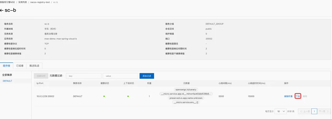 7. 我们通过服务治理方式注册的服务,我们还可以通过服务治理方式将对应的节点从 MSE Nacos 中下线
