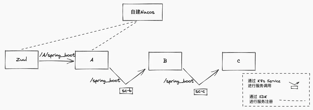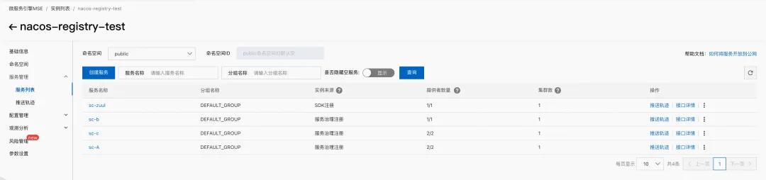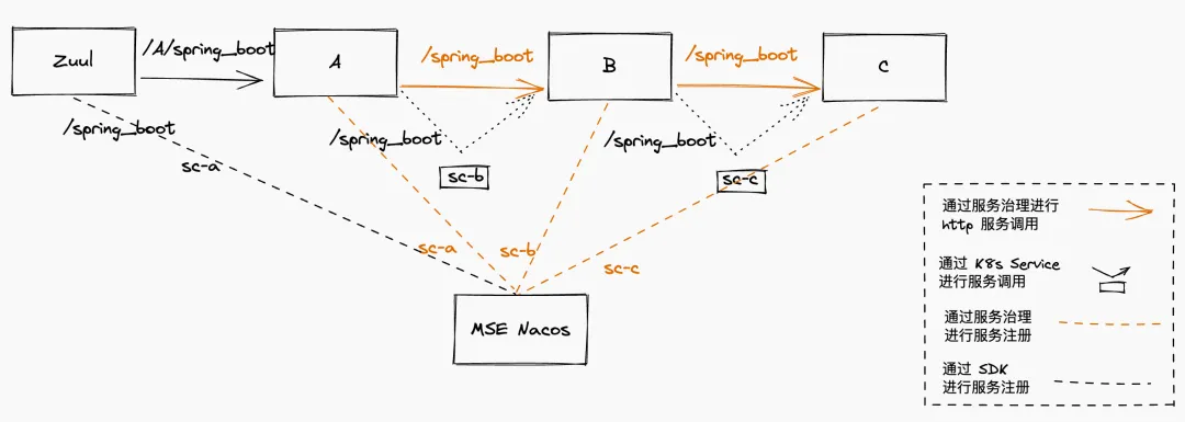 其中 sc-b 为服务名,默认的分组名可以通过 mse_nacos_group 指定,如果需要指定分组名可以调用 http://sc-b:20002/spring_boot?mse_nacos_group=xxx 即可。