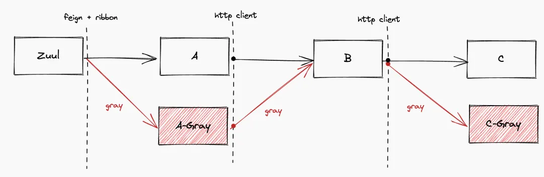 到目前为止,我们默认就具备了符合如上场景的全链路灰度能力。