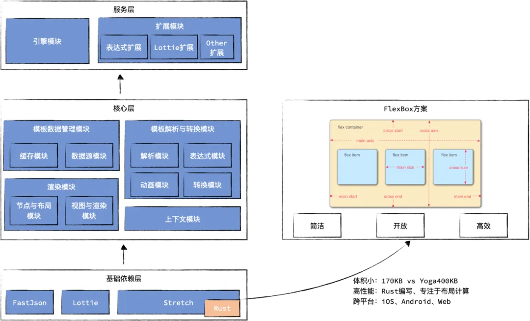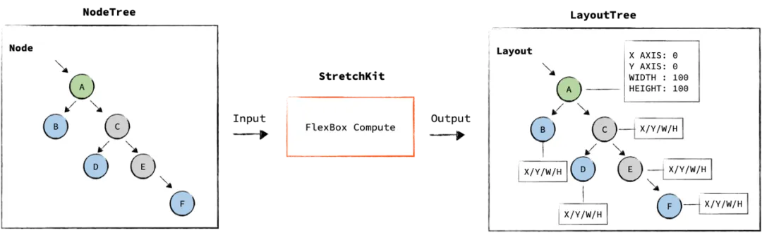 Stretch是基于Rust语言编写的跨平台FlexBox布局计算库,通过传入节点树和视口尺寸,就能计算出各个节点的基于绝对布局的坐标信息(宽、高、X轴Y轴偏移量),而这便是GaiaX能够跨平台的关键。