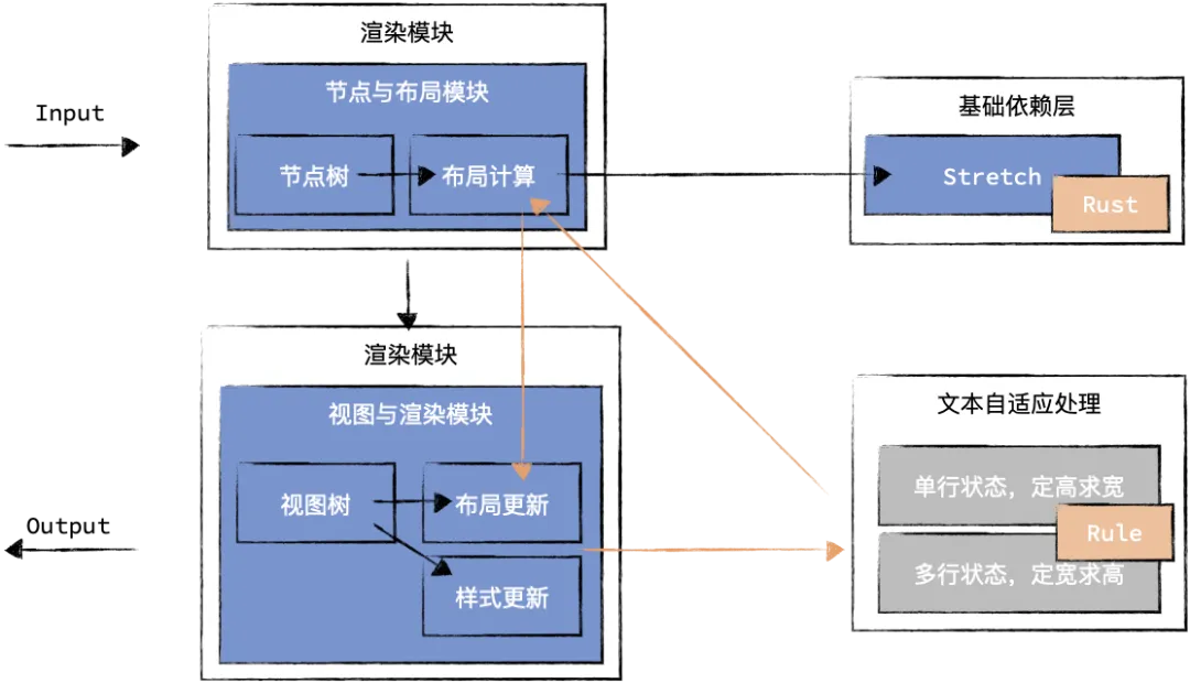 在渲染模块中包含了两个子模块 - 节点与布局模块和视图与渲染模块。节点与布局模块中包含很多逻辑,节点的定义、节点树的创建、节点树的更新、节点树到布局信息产物的计算逻辑(会使用到Stretch)以及对文字自适应的处理。视图与渲染模块中则包含了视图树的创建、视图树的层级合并、视图树的样式设置、视图树的数据绑定、视图类型的定义(GXView、GXScroll、GXText等等)等逻辑。