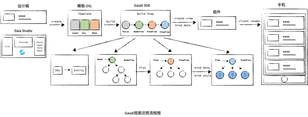 GaiaX是由优酷应用技术中心团队研发的一款跨端高性能渲染引擎,其本质是个视图还原框架,其核心理念是将模板还原成双端的视图组件,我们先通过一个视图还原渲染的流程图,看看GaiaX的上下游是如何工作的: