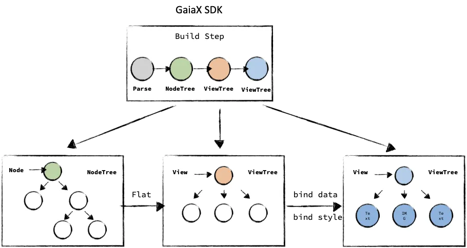 GaiaX:在双端上通过使用SDK来解析模板的内容,经过节点树的构建和视图树的构建、视图树的数据绑定等步骤后,得到Native视图,最终交给双端渲染。