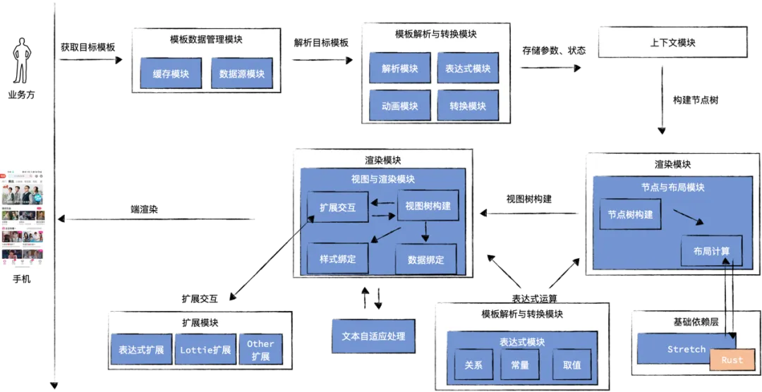 渲染模块 - 视图与渲染模块:当视图树构建成功后,此时视图树中的每个子视图还只是空壳子,还需要为视图树设置样式和绑定数据,此时业务方会调用bindData方法,进行数据的绑定和样式的更新。在这个过程中,需要为每个子视图绑定样式、事件、动画等,在这个过程中也会和一些扩展逻辑进行交互,例如:响应式、基础组件库、DesignToken、暗黑模式等;也需要为每个子视图绑定数据,每个子视图的数据绑定逻辑都由两个部分构成 - Value取值逻辑和Extend扩展逻辑,在值和扩展中,都可以使用表达式来构建。等这些全部处理结束后,一个携带布局、样式、数据的视图树就构建完成了。