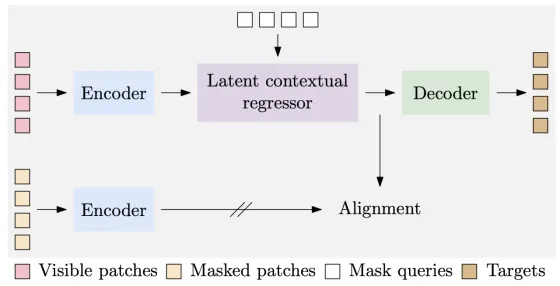 - 潜在表征对齐(Latent representation alignment)通过对添加约束,希望Latent contextual regressor 的输出和编码器的输出在同一编码空间中。该方法将图像的掩码 patch 也输入到编码器,获得这部分的表征。将作为学习的目标。计算的过程不会计算梯度。