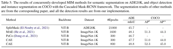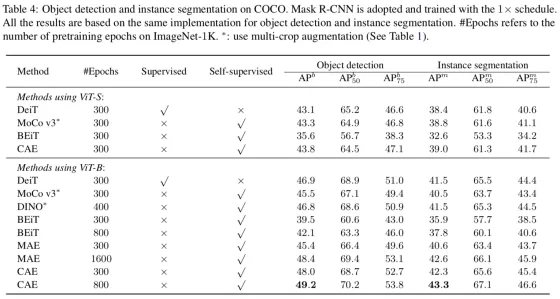 4.4 目标检测、实例分割该研究使用 Mask-RCNN 和 Cascade-RCNN 两种网络结构进行目标检测和实例分割的实验。其中,使用多尺度训练 12 epoch,测试阶段仅使用单尺度测试。实验结果和语义分割类似:对比学习方法和监督预训练方法的结果类似且较差,CAE 的结果更好。
