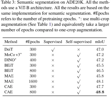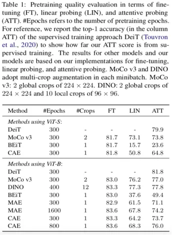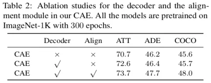 该研究提出了 CAE,设计的核心有两点:(1) 对 “表征学习” 和 “解决前置任务” 这两个功能做完全分离; (2) 在可见 patch 学习到的表征空间中对掩码 patch 做预测。以上两点都是为了驱使编码器学习更好的表征,从而在下游任务取得良好的泛化能力。